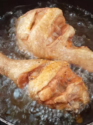 – Bắc chảo lên bếp, đổ dầu vào chảo cho nóng già thì thả miếng đùi gà vào chảo, để lửa nhỏ liu riu thì gà mới chín được vào bên trong.