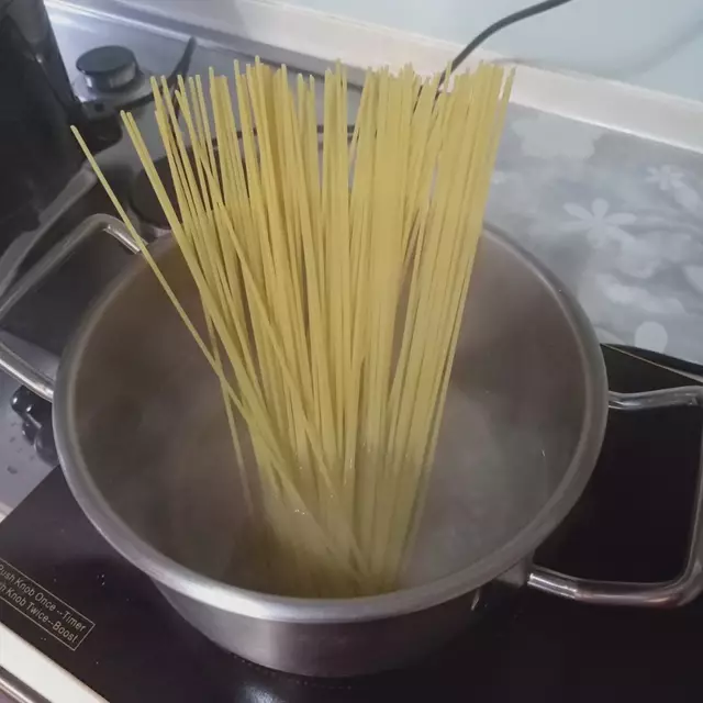 Luộc Mì Spaghetti: làm theo hướng dẫn trên bao bì nhé.