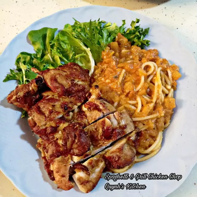 - Nguyên liệu: Đùi gà tỏi lóc xương (hoặc ức gà) / Salad / Mỳ Spaghetti / Tương Cà Mỳ ý (loại đóng hộp)