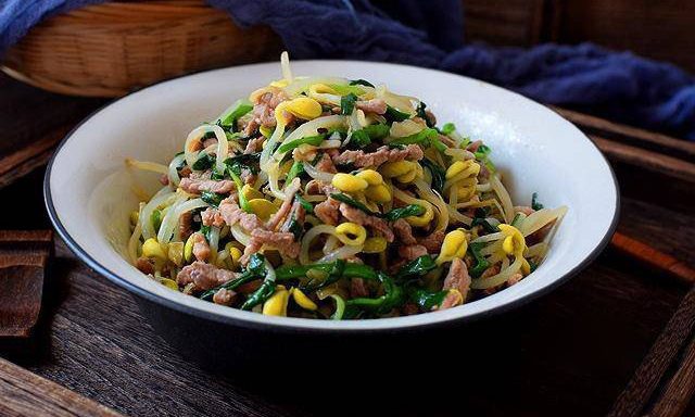 Thịt heo cắt nhỏ như đầu đũa, dài khoảng 5cm, lăn qua bột mì thô để nguyên trong 30 phút. Tỏi tây, giá đỗ rửa sạch để ráo nước. Phi thơm tỏi, gừng, cho thịt vào xào đến khi thấy có chút cháy sém là được. Tiếp theo, cho giá đỗ, tỏi tây vào đảo cùng, thêm rượu nấu ăn, gia vị vào là xong.